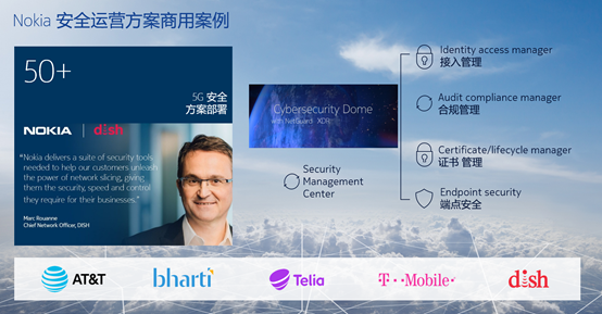 诺基亚贝尔安全运营方案已部署在全球50+运营商网络中,提供安全运营中心、接入安全管理、安全合规审计、安全证书管理和网络端点安全等方案。