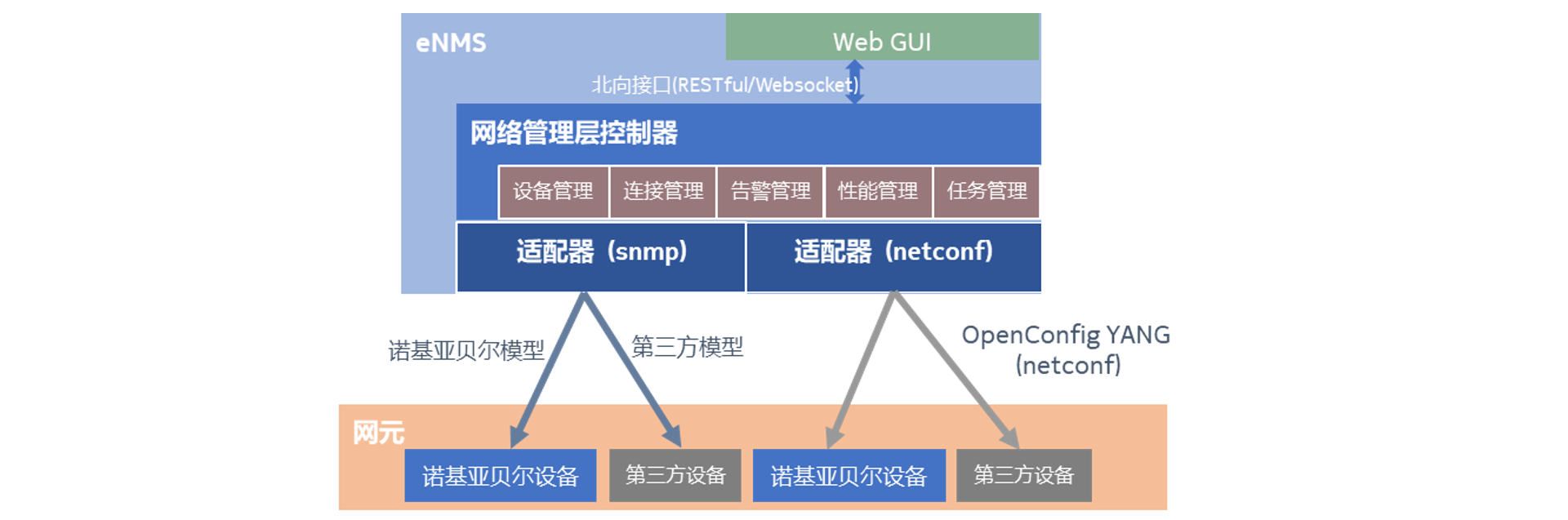 – 网元适配层:为客户网络中的诺基亚贝尔以及第三方设备提供标准的网管南向接口。