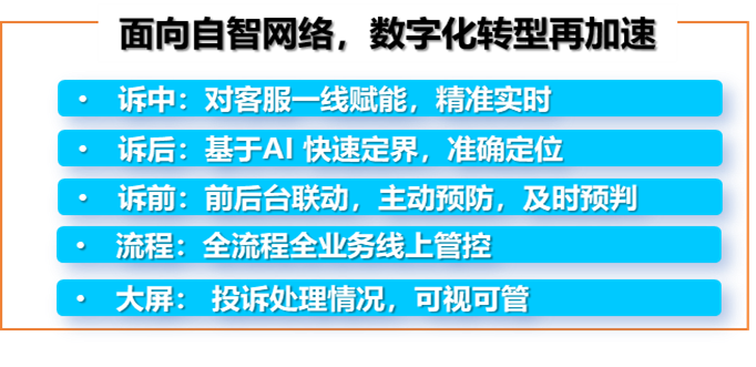 针对一线客服产生的投诉工单,以全自动的方式关联投诉处理相关的各种数据源,结合无线优化专家的经验规则库和AI算法,输出用户投诉问题定界,并对无线问题进一步输出主因小区及根因问题。同时关联网元告警、退服等,及时给出投诉预警。对处理后的工单进行闭环验证,对投诉热点区域及共性问题进行聚合分析。提高投诉隐患消除率、提升投诉处理效率、加快工单问题完成,实现投诉压降、提升用户满意度。
